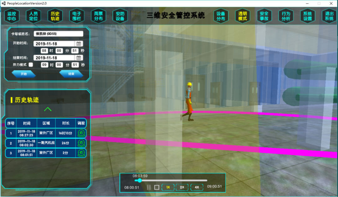 歷史軌跡通過單人、多人以及熱力圖模式對歷史軌跡進行查詢。多維度數據及查看方式方便變電站管理人員對位置歷史數據進行有效分析和利用。